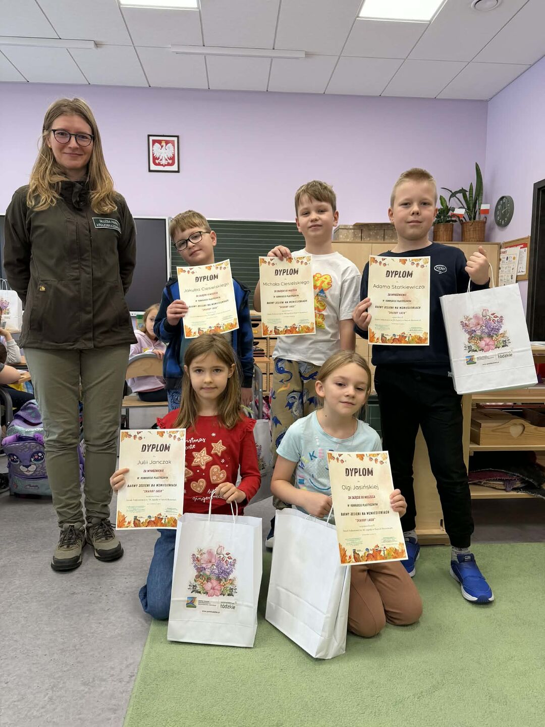 Zwieńczeniem tegorocznej edycji konkursu plastycznego „Barwy jesieni na Wzniesieniach - skarby lasu” było uroczyste wręczenie dyplomów i nagród dla uczniów, których prace zostały wyróżnione. Spotkania z nagrodzonymi uczniami przyjęły czasem charakter bardzo uroczysty, czasem odbyły się formie złożenia na ręce Dyrekcji, a czasem w kameralnym gronie klasowym w towarzystwie nauczyciela prowadzącego. Radość na twarzach uczniów, których nazwiska były wyczytywane w towarzystwie kolegów była ogromna, zatem dzielimy się tą zatrzymaną w kadrze chwilą sympatycznej atmosfery, jednocześnie przypominając, że kolejna edycja konkursu…odbędzie się już za rok!