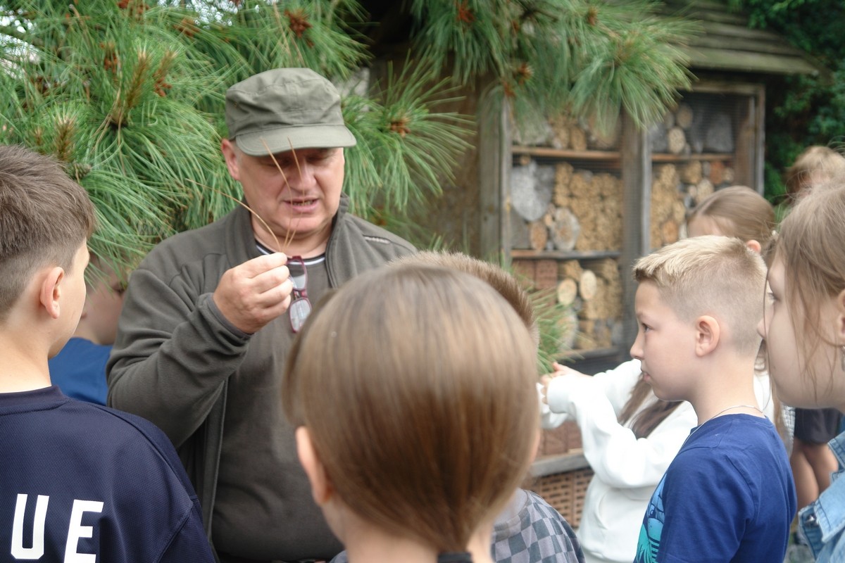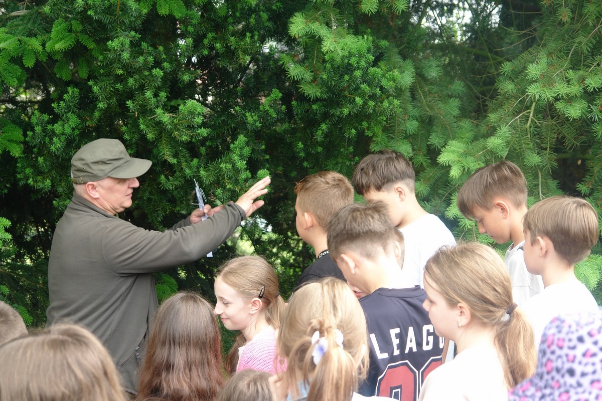 Następnie grupa udała się na zaplecze biura Parku, gdzie znajduje się kolekcja rosnących drzew iglastych. Tam uczniowie mieli okazję zobaczyć w naturalnym środowisku długie igły sosny wejmutki (rosnące po pięć), sztywne igły sosny żółtej (po trzy w pęczku) oraz krótkie, podwójne igły sosny zwyczajnej. Nauczyli się, jak rozpoznać spłaszczone igły jodły z charakterystycznymi białymi paskami od spodu, a także miękkie igły cisu. Szczególną uwagę zwrócono na kłujące, srebrzyste igły świerka srebrzystego oraz na wyjątkowy przypadek modrzewia, którego miękkie igły, w przeciwieństwie do innych iglaków, opadają na zimę.