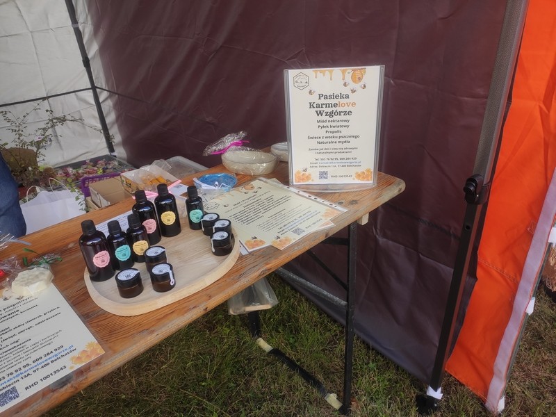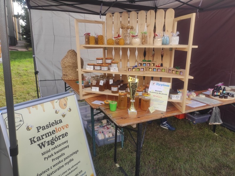 Na terenie szkoły zorganizowano liczne stoiska wystawiennicze, oferujące materiały edukacyjne, sprzęt pszczelarski oraz produkty pszczele, w tym miody i ich przetwory.
