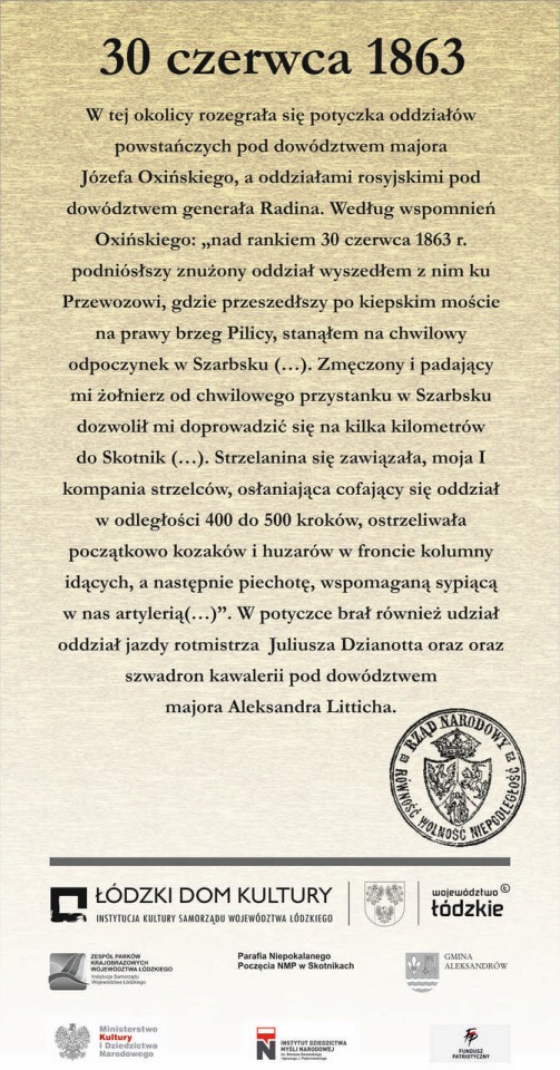 • Skotniki – drewniany krzyż z tablicą objaśniającą przebieg potyczki oddziałów powstańczych pod dowództwem majora Józefa Oxińskiego z oddziałami rosyjskimi pod dowództwem generała Radina. Według wspomnień Oxińskiego: „nad rankiem 30 czerwca 1863 r. podniósłszy znużony oddział wyszedłem z nim ku Przewozowi, gdzie przeszedłszy po kiepskim moście na prawy brzeg Pilicy, stanąłem na chwilowy odpoczynek w Szarbsku (…). Zmęczony i padający mi żołnierz od chwilowego przystanku w Szarbsku dozwolił mi doprowadzić się na kilka kilometrów do Skotnik (…). Strzelanina się zawiązała, moja I kompania strzelców, osłaniająca cofający się oddział w odległości 400 do 500 kroków, ostrzeliwała początkowo kozaków i huzarów w froncie kolumny idących, a następnie piechotę, wspomaganą sypiącą w nas artylerią(…)”.
